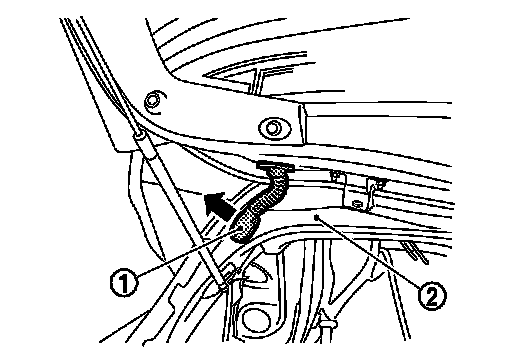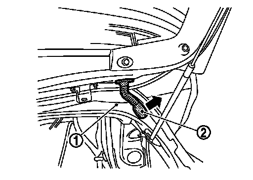 9.Remove grommet (2), and then pull out harness and washer tube from roof panel (1).