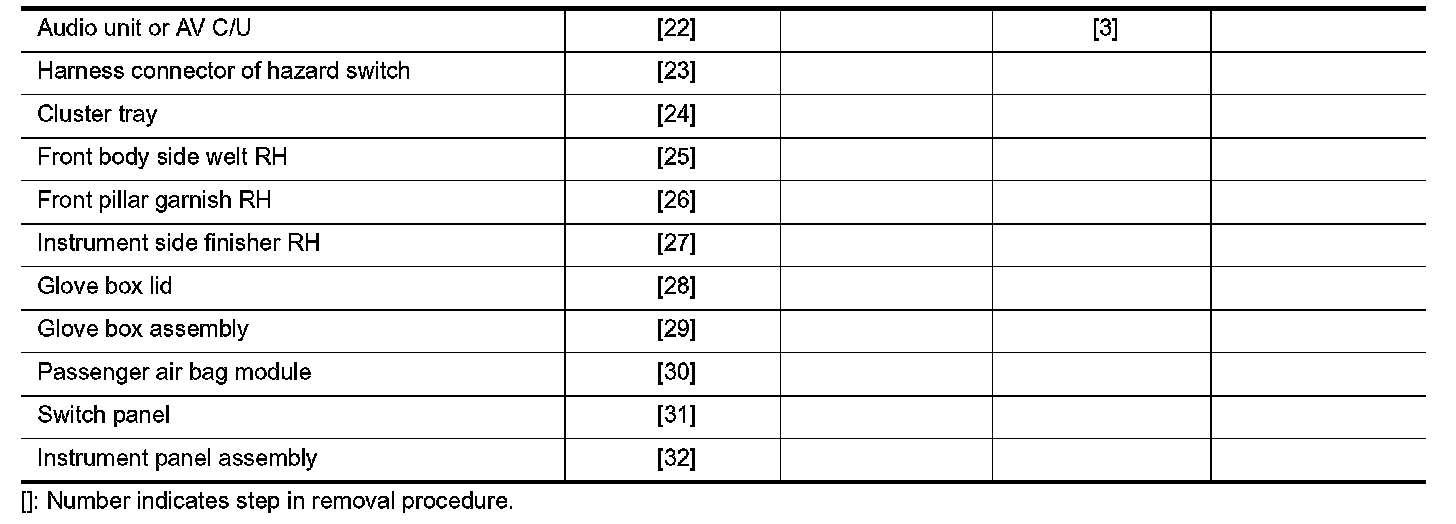 When removing instrument panel assembly, combination meter, audio unit, NAVI C/U, or center console assembly take steps in the order shown by the numbers below.