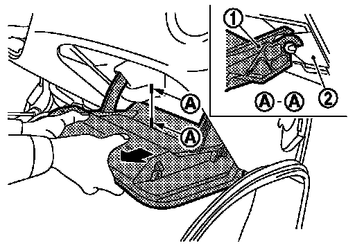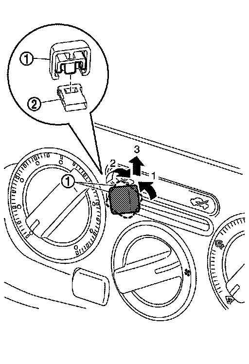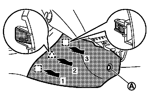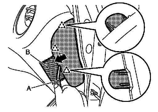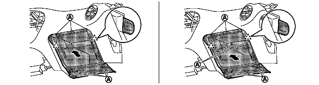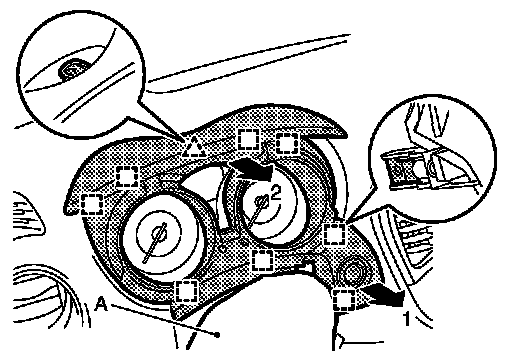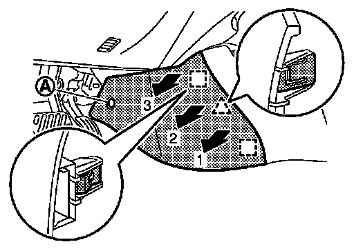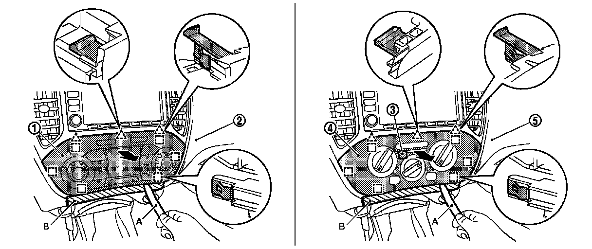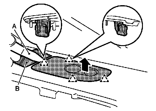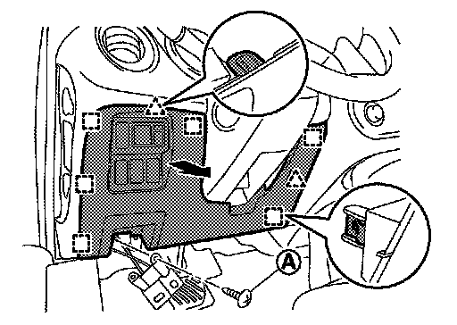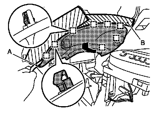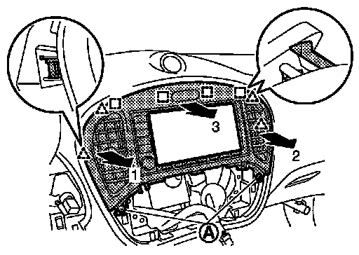 1.Insert remover tool (A) between switch panel and instrument panel assembly to disengage the pawls as shown in the figure.