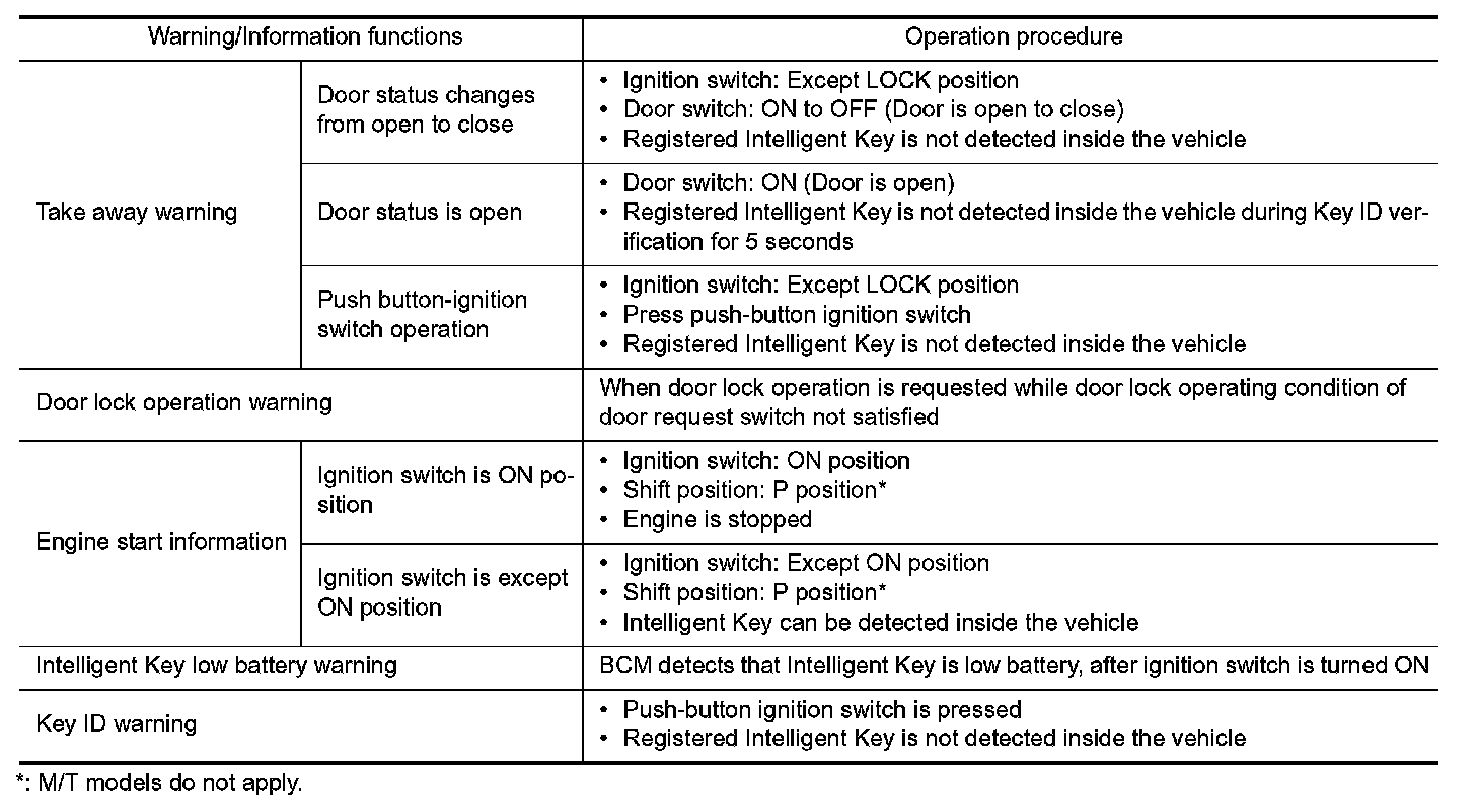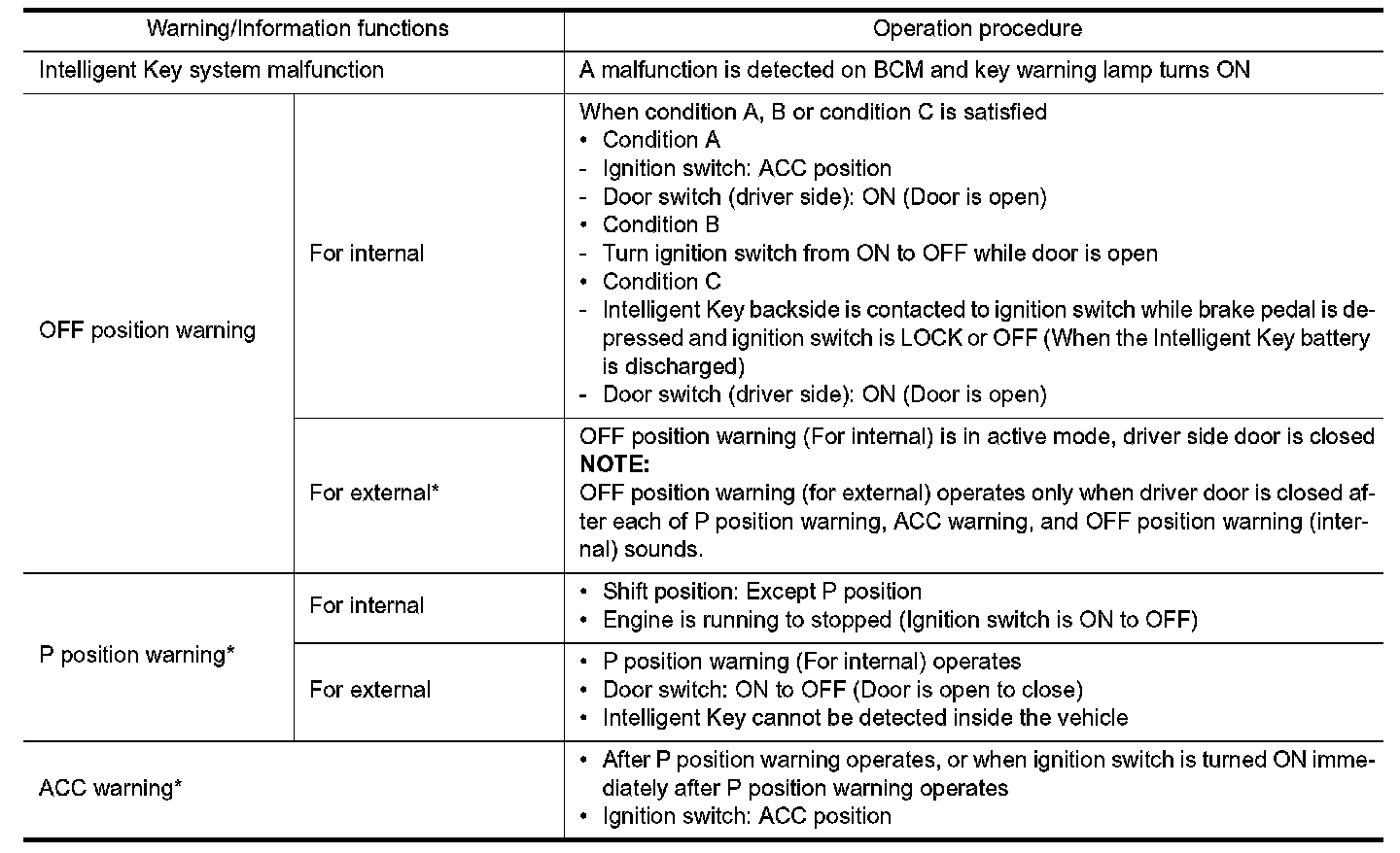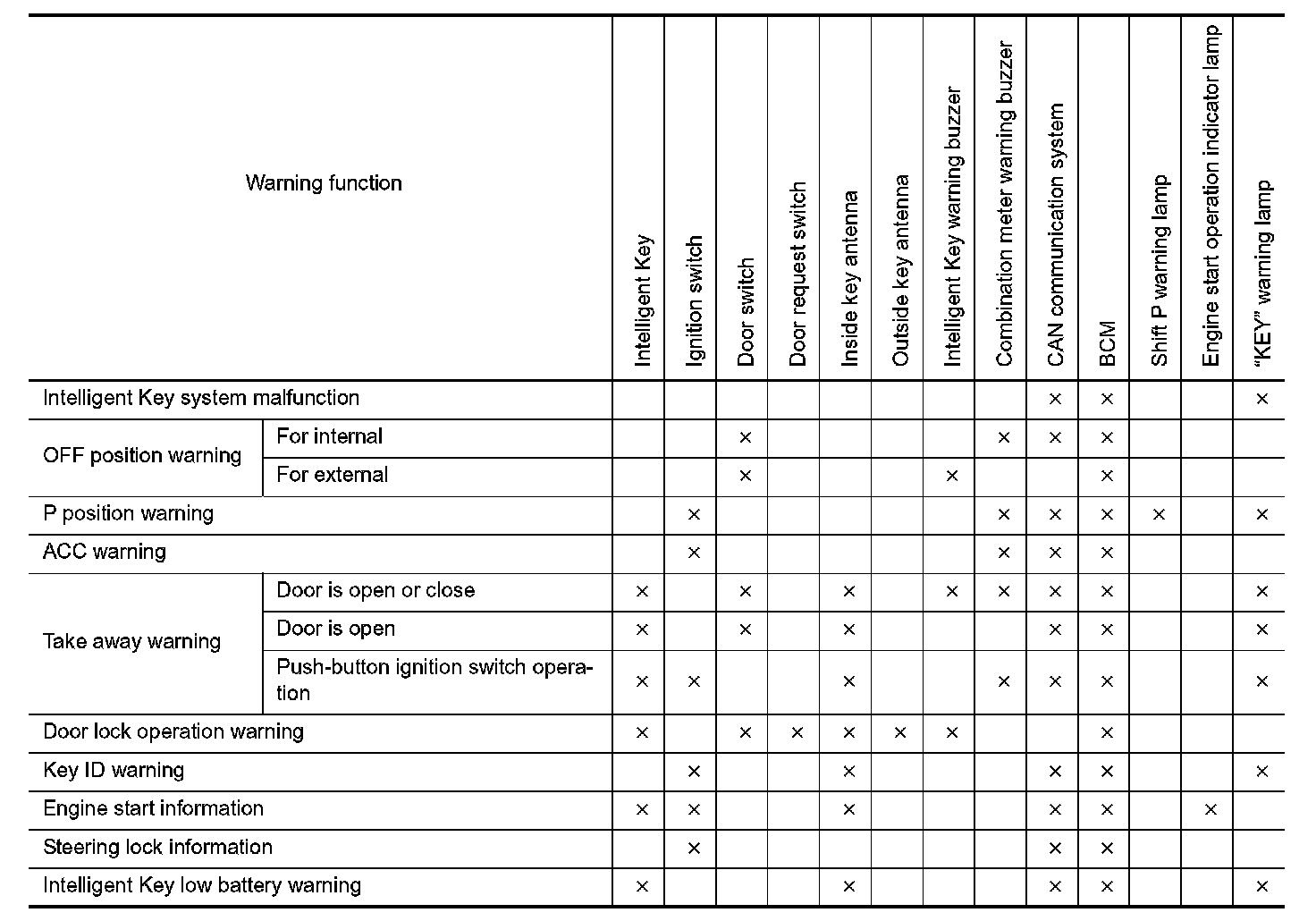 The warning function are as per the following items and are given to the user as warning information and warnings using combinations of Intelligent Key warning buzzer, combination meter buzzer, KEY warning lamp, shift P warning lamp and engine start operation indicator lamp.