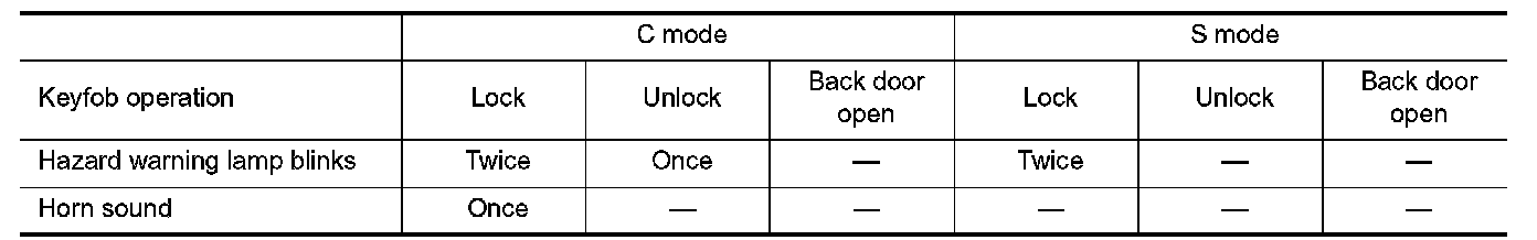 The hazard and horn reminder has a horn chirp mode (C mode) and a non-horn chirp mode (S mode).