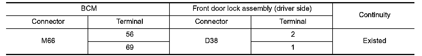 2.Check continuity between BCM harness connector and front door lock assembly (driver side) harness connector.