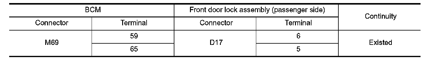 2.Check continuity between BCM harness connector and front door lock assembly (passenger side) harness connector.