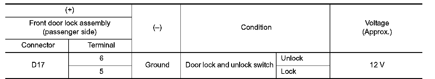 3.Check voltage between front door lock assembly (passenger side) harness connector and ground.