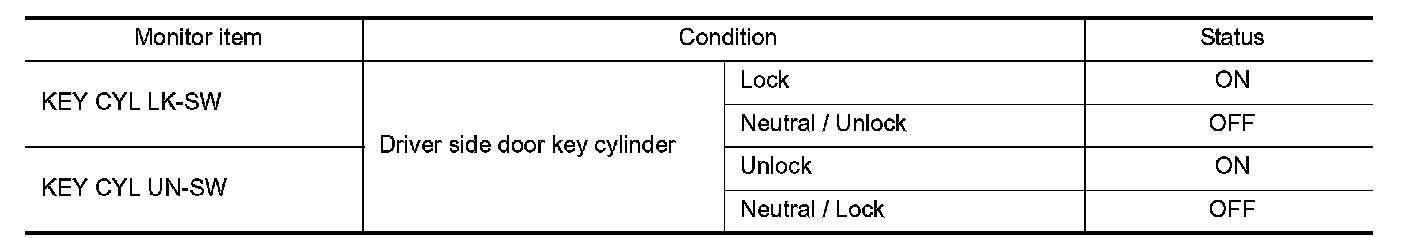 2.Select "KEY CYL LK SW", "KEY CYL UN-SW" in "DATA MONITOR" mode.