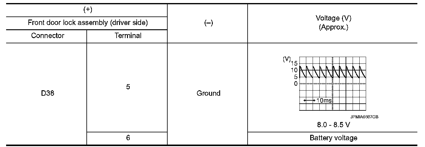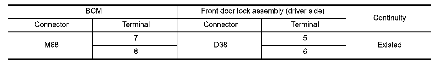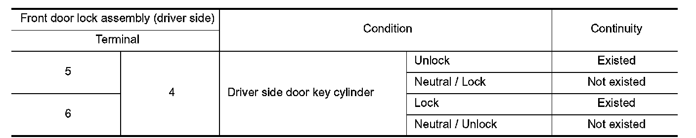 3.Check continuity between front door lock assembly (driver side) terminals.