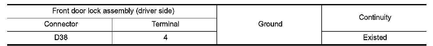 Check continuity between front door lock assembly (driver side) harness connector and ground.