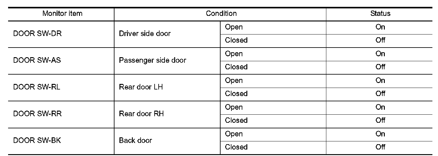 2.Select "DOOR SW-DR", "DOOR SW-AS", "DOOR SW-RL", "DOOR SW-RR", "BACK DOOR SW" in