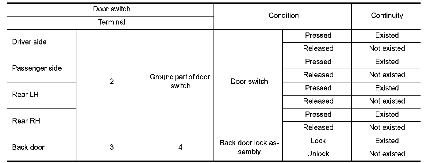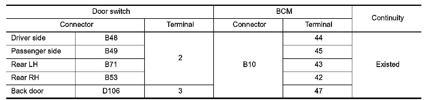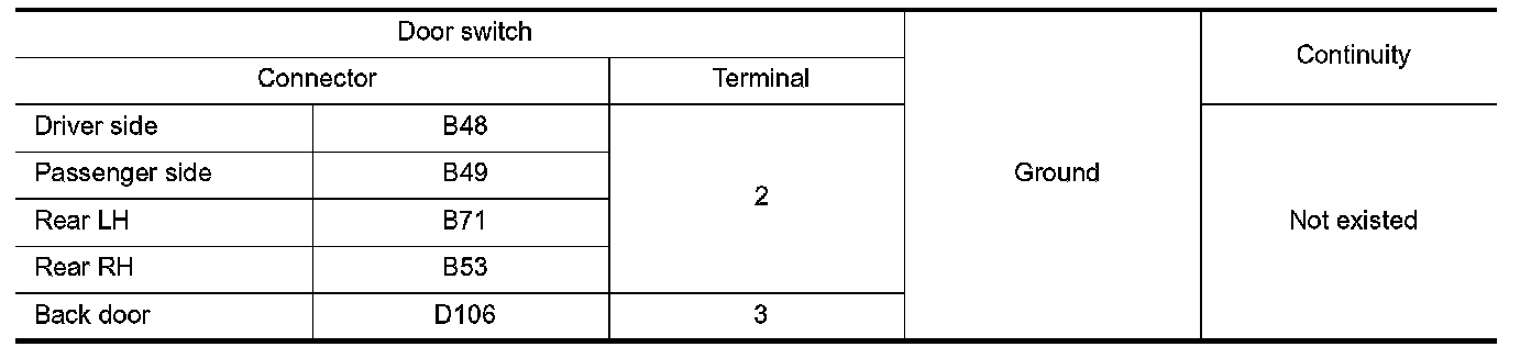 3.Check continuity between door switch harness connector and ground.