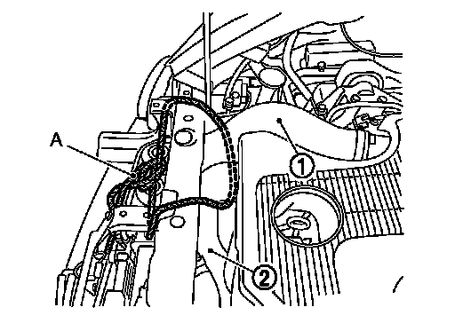 3.Using strings (A), hang inlet hose (1) and inlet hose (2) together with charge air cooler.