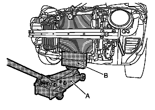 4.Support lower side radiator using wooden blocks (A) and a floor jack (B).