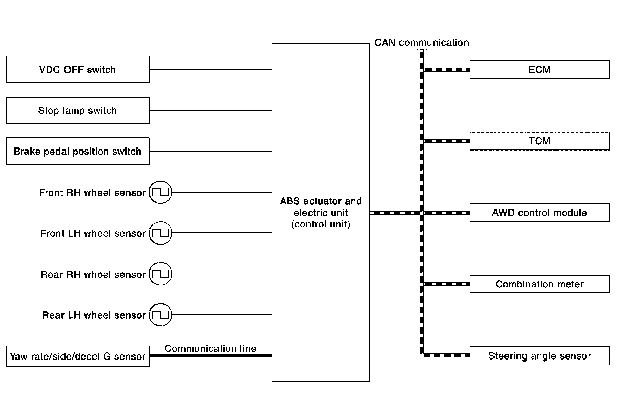The vehicle status becomes the same as models without VDC function, TCS function and brake limited slip differential (BLSD) function. However, ABS function and EBD function are operated normally. Fail Safe.