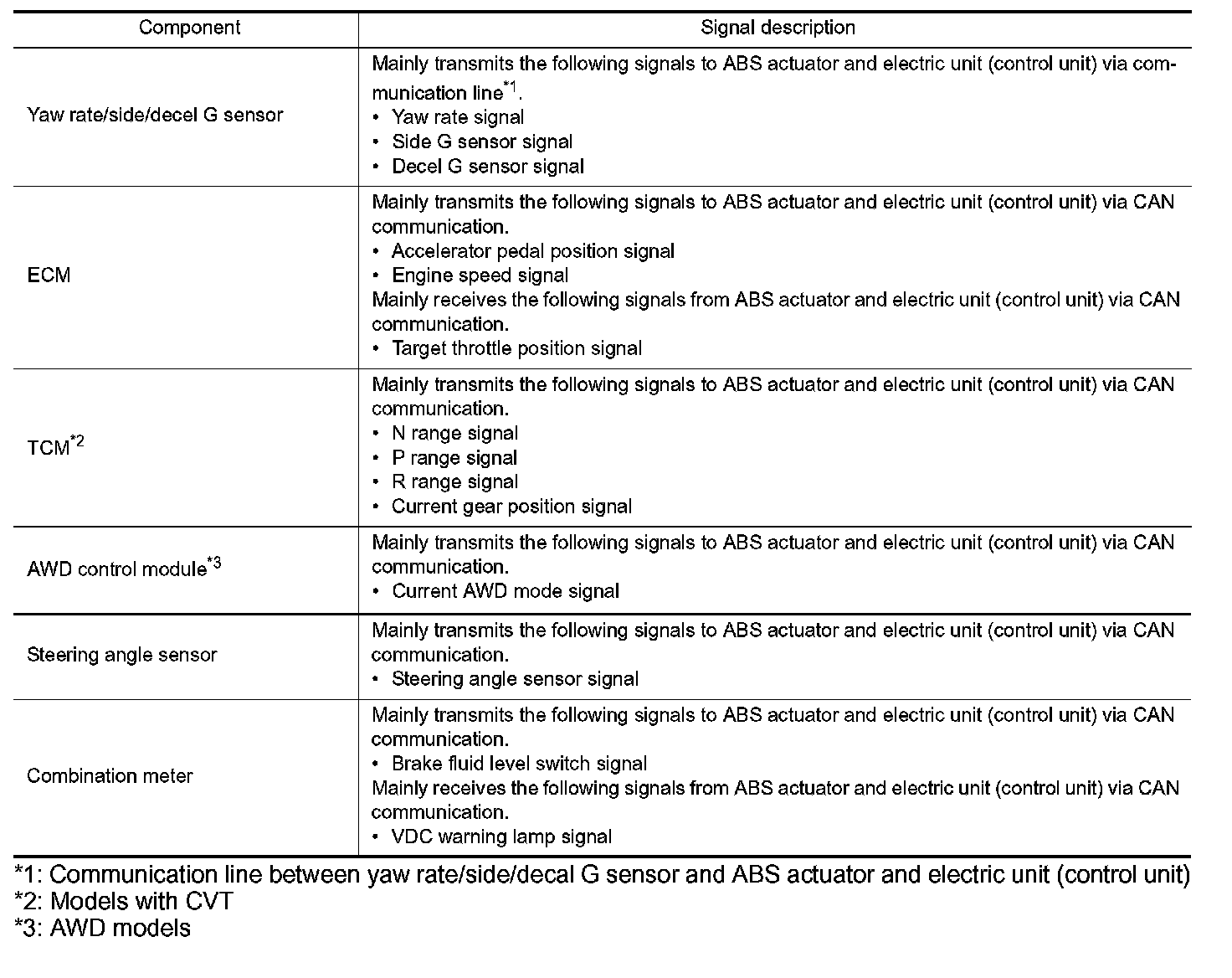 Major signal transmission between each unit via communication lines is shown in the following table.
