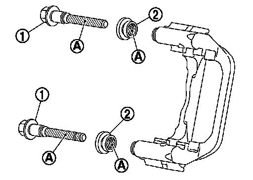 6.Apply rubber grease to mating faces (A) between sliding pin bolt (1) and sliding pin boot (2), and install sliding pin and sliding pin boot to sliding torque member.