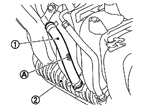 Since check valve is built-in inside vacuum hose (1), install the vacuum hose fitting the arrow (A) to intake manifold side (2).