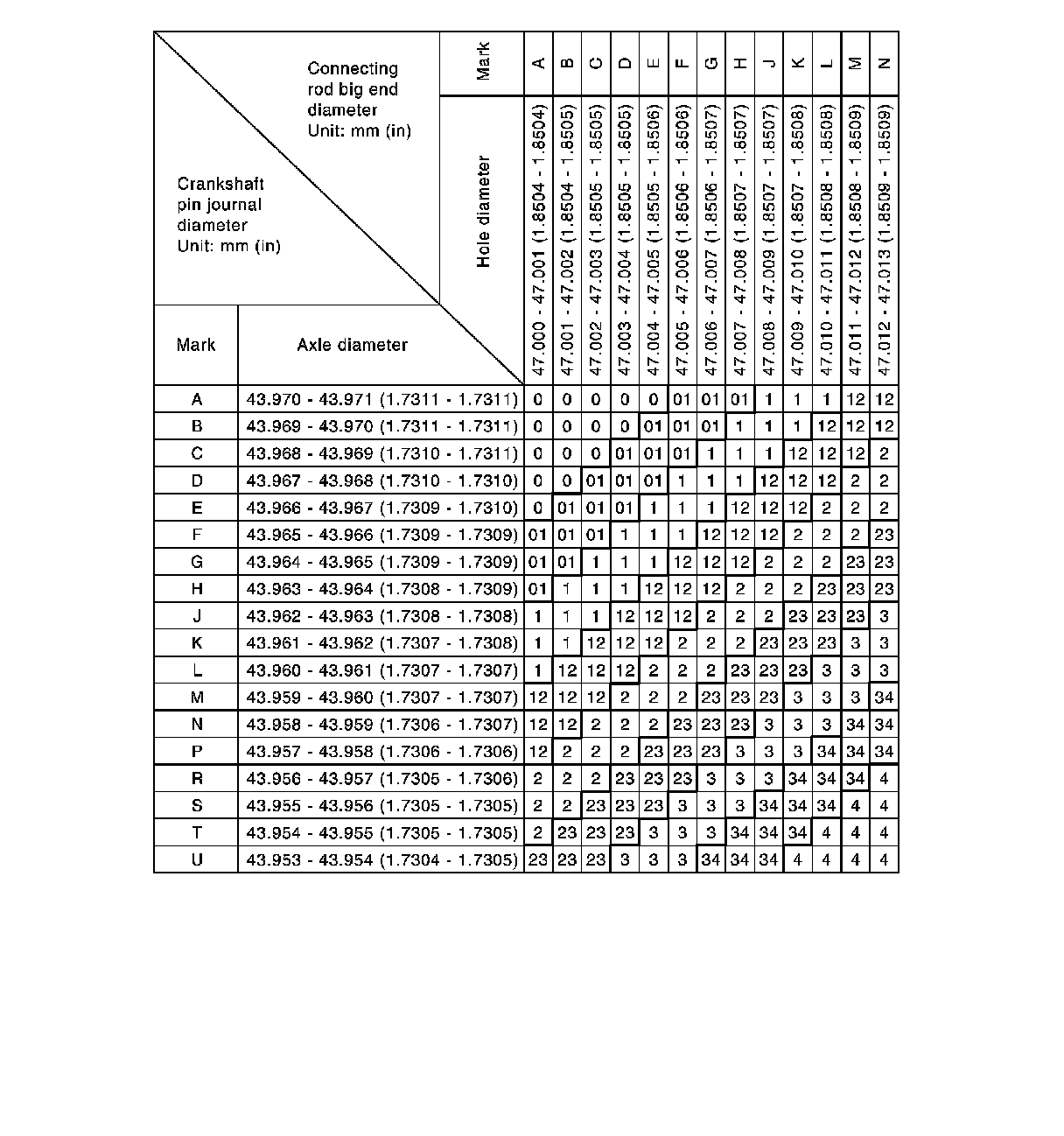 3.Read the symbol at the cross point of selected row and column in the "Connecting Rod Bearing Selection