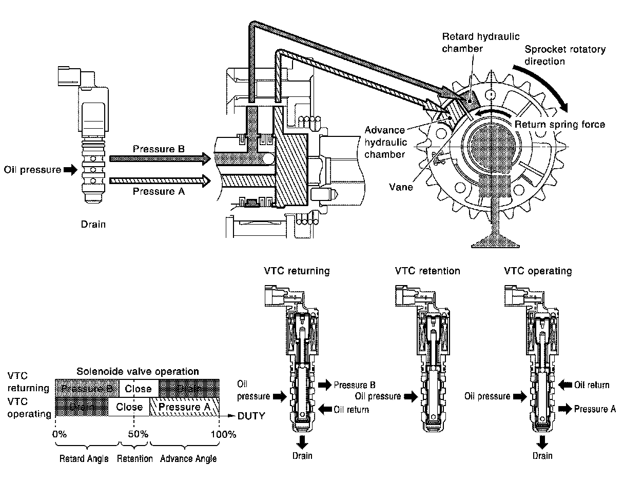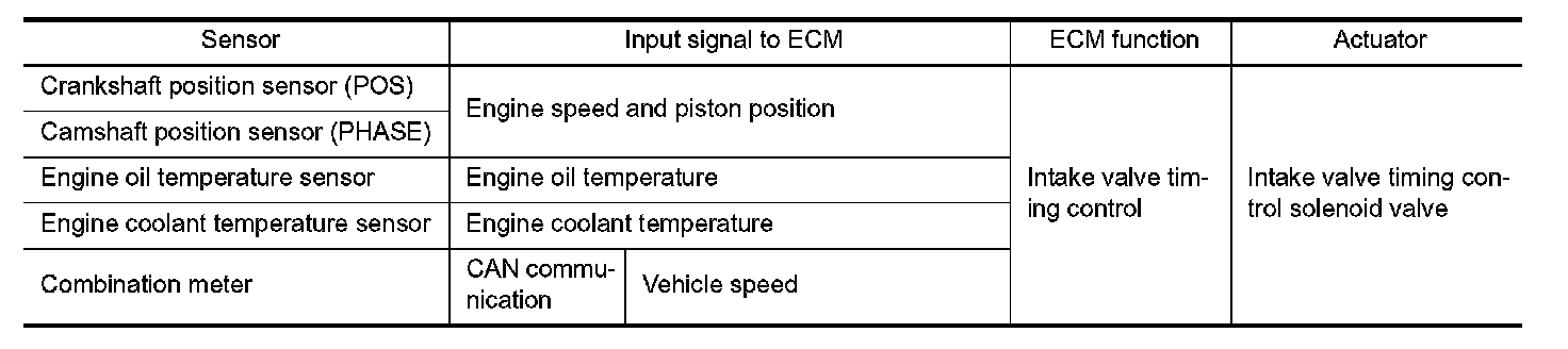 The ECM receives signals such as crankshaft position, camshaft position, engine speed, and engine coolant temperature. Then, the ECM sends ON/OFF pulse duty signals to the intake valve timing (IVT) control solenoid valve depending on driving status. This makes it possible to control the shut/open timing of the intake valve to increase engine torque in low/mid speed range and output in high-speed range.