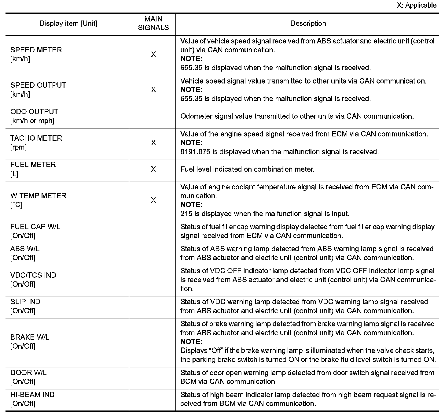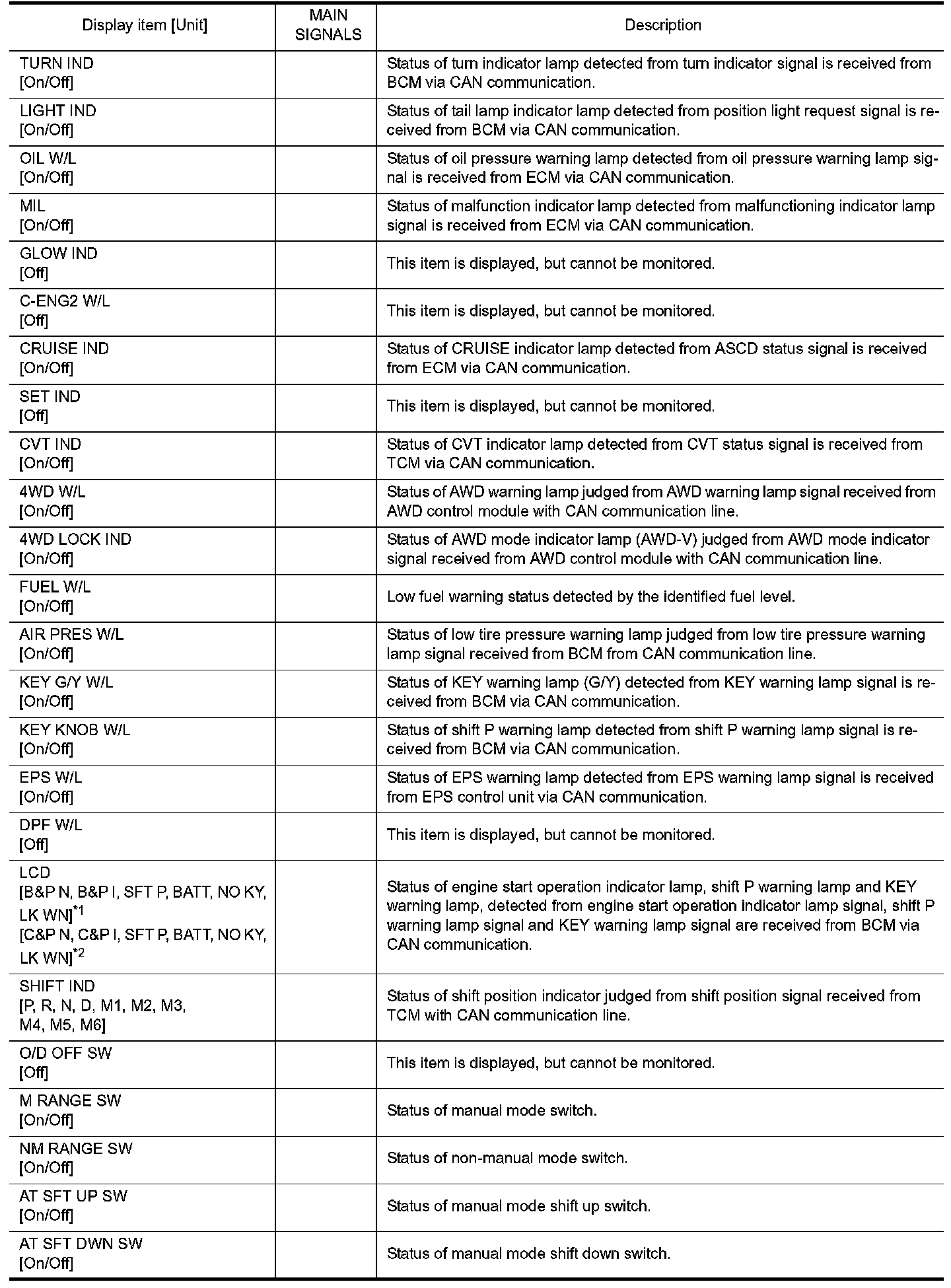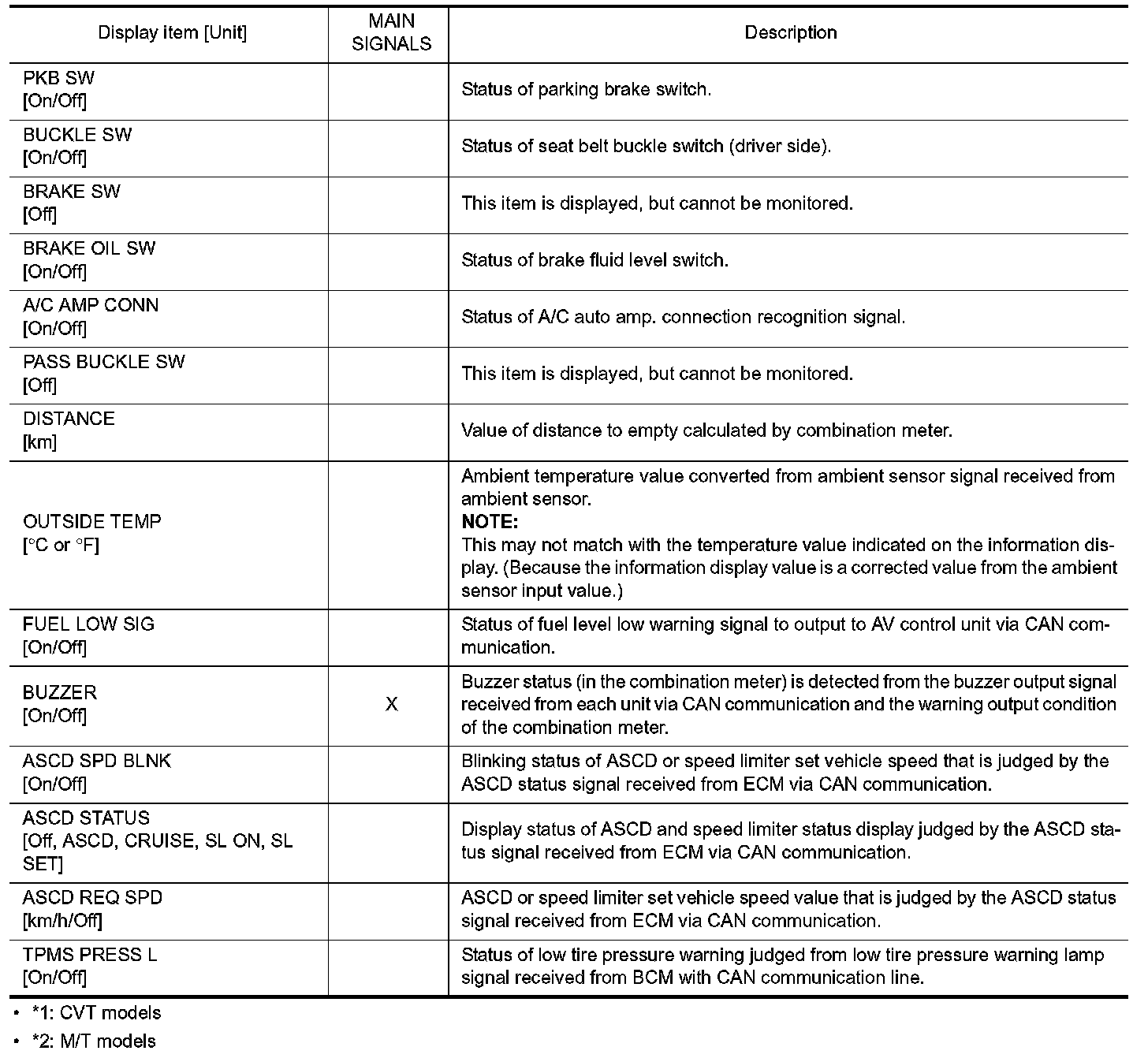In items displayed on the CONSULT screen, only those listed in the above table are used.