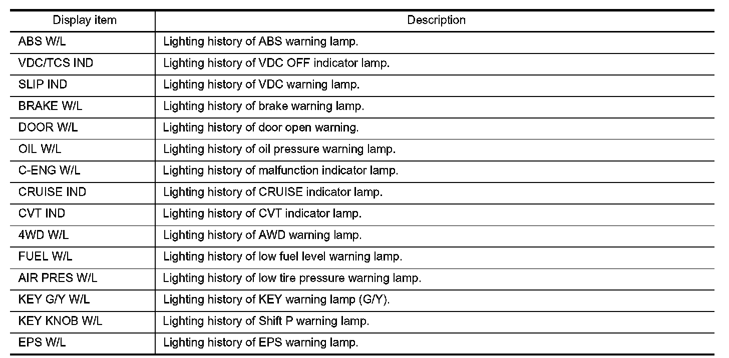 - "W/L ON HISTORY" indicates the "TIME" when the warning/indicator lamp is turned on.