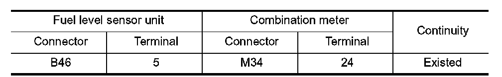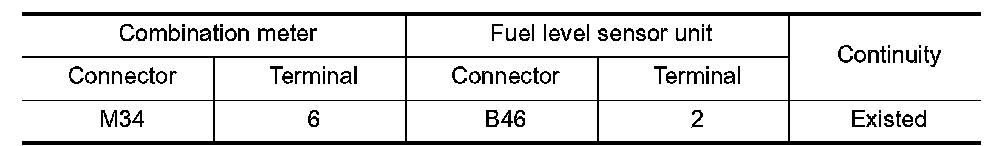 3.Check continuity between combination meter harness connector terminal and fuel level sensor unit harness connector terminal.