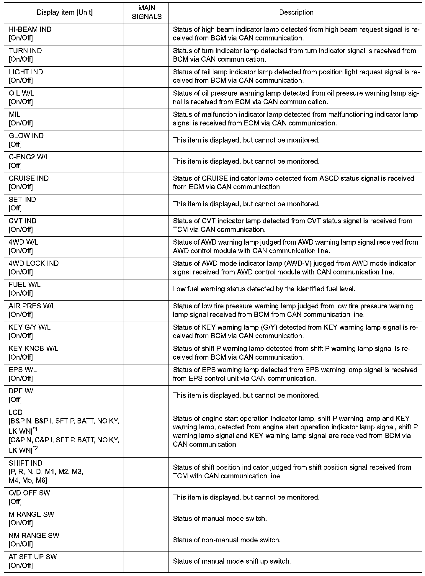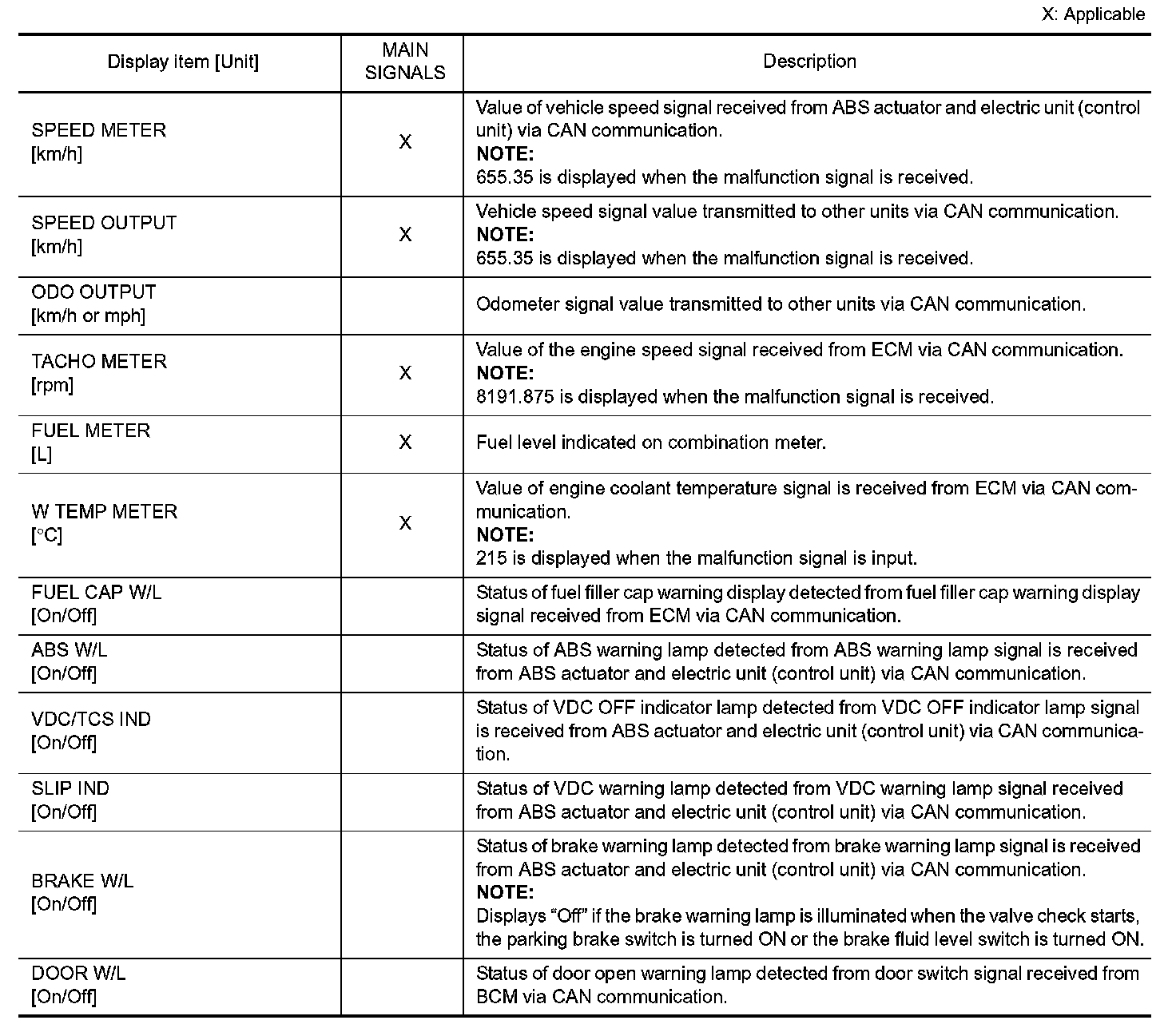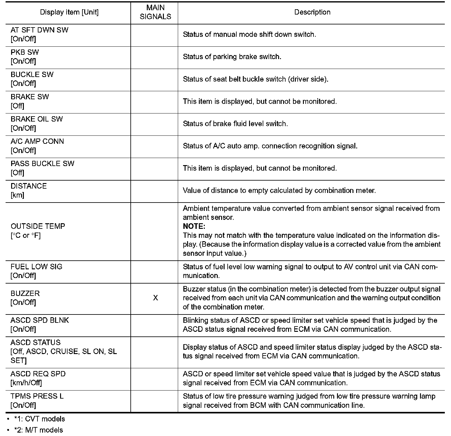 In items displayed on the CONSULT screen, only those listed in the above table are used.