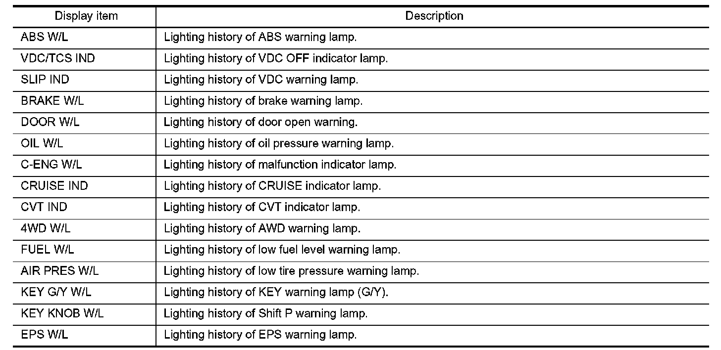 - "W/L ON HISTORY" indicates the "TIME" when the warning/indicator lamp is turned on.