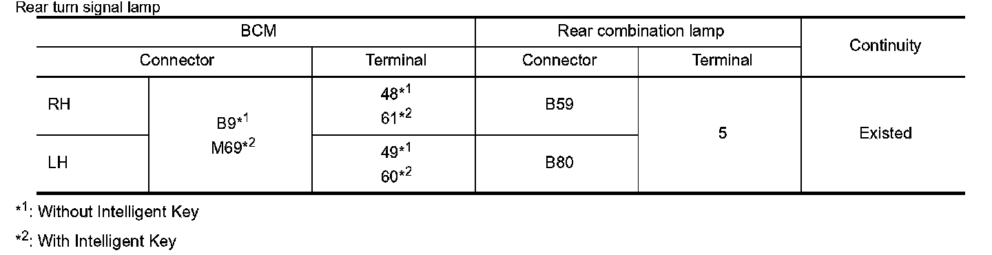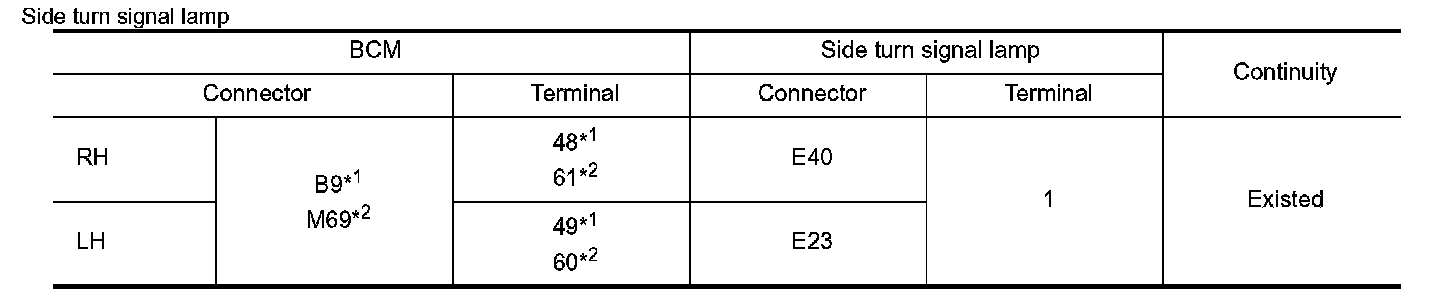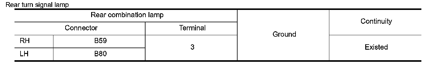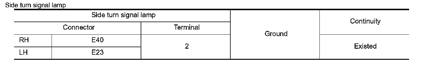Check continuity between BCM harness connector and front turn signal lamp, side turn signal lamp or rear combination lamp and ground.