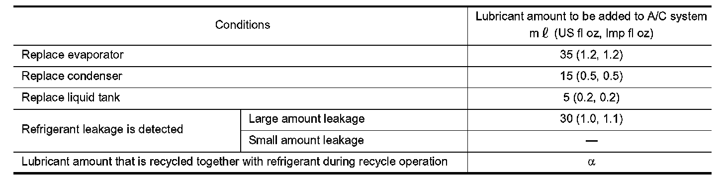Example: Lubricant amount to be added when replacing evaporator and liquid tank [ml (US fl oz, Imp fl oz)] = 35 (1.2, 1.2) + 5 (0.2, 0.2) + Alpha