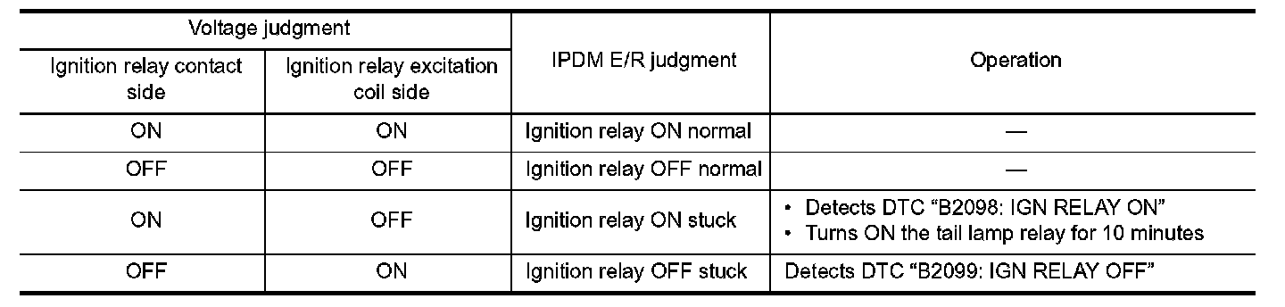 - IPDM E/R judges the ignition relay error if the voltage differs between the contact circuit and the excitation coil circuit.