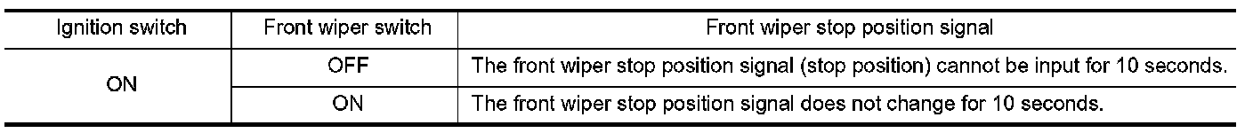 When a front wiper stop position signal is in the conditions listed below, IPDM E/R stops power supply to wiper after repeating a front wiper 10 seconds activation and 20 seconds stop.