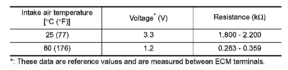 The intake air temperature sensor 1 is built-into mass air flow sensor. The sensor detects intake air temperature and transmits a signal to the ECM.