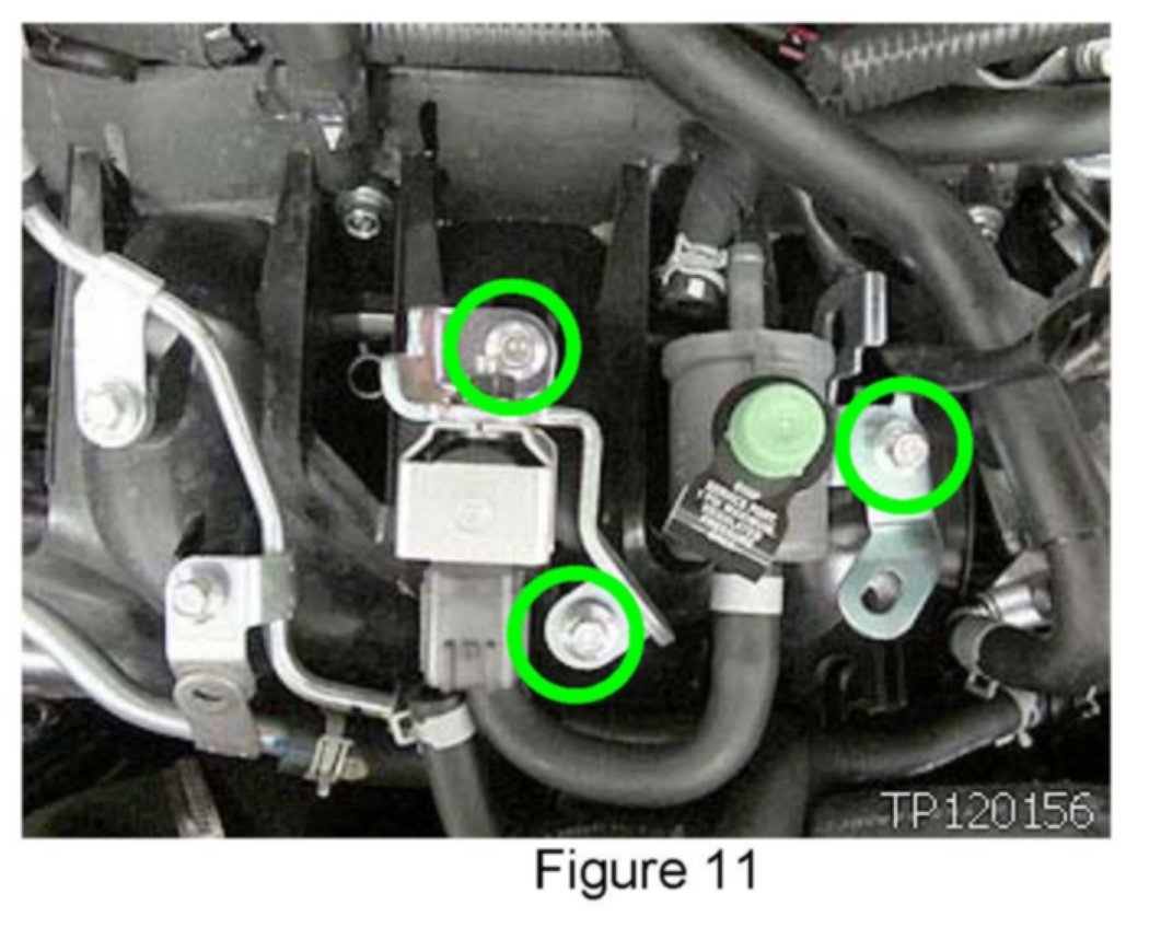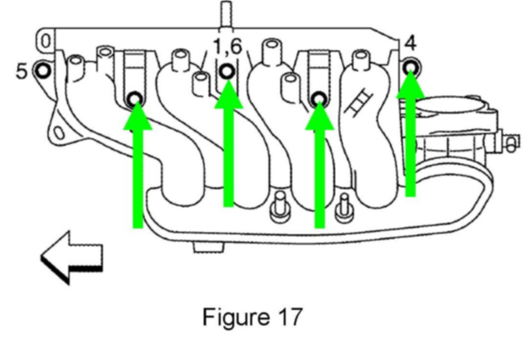 20. Using 10 mm socket, remove 5 intake manifold bolts on top of intake, shown by green arrows in Figure 17.