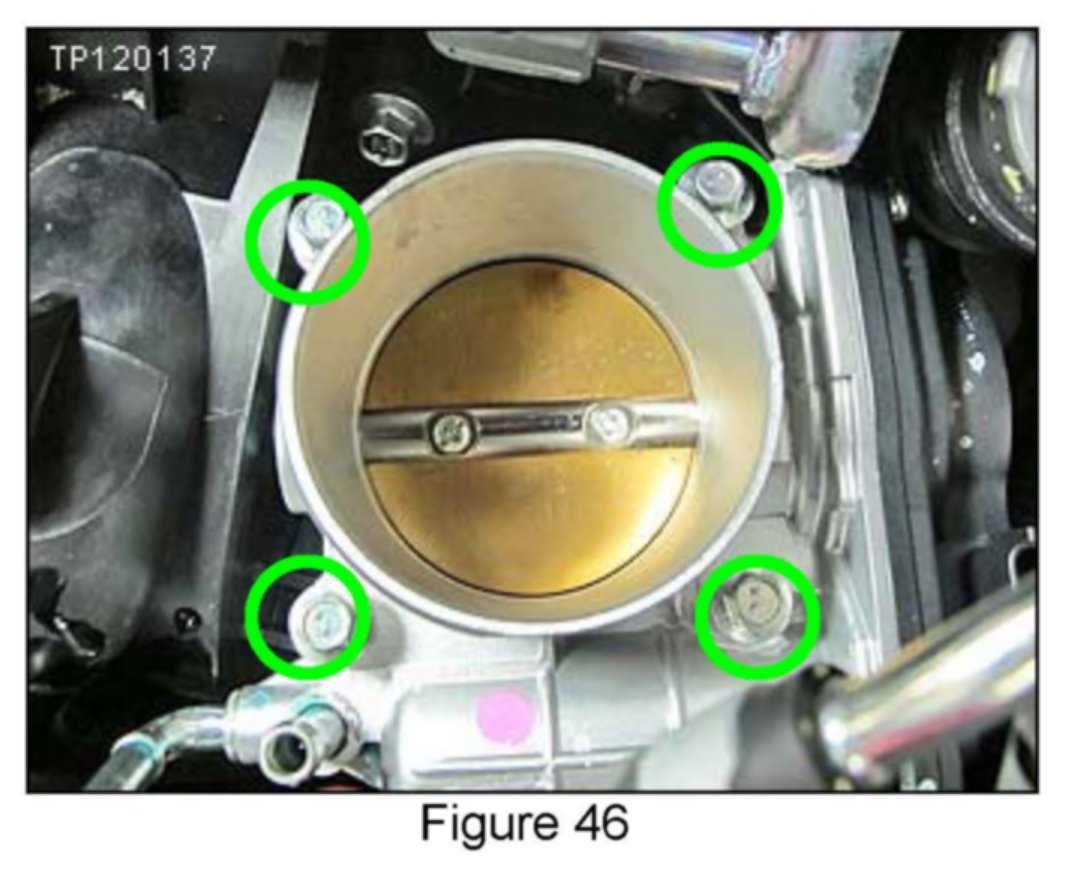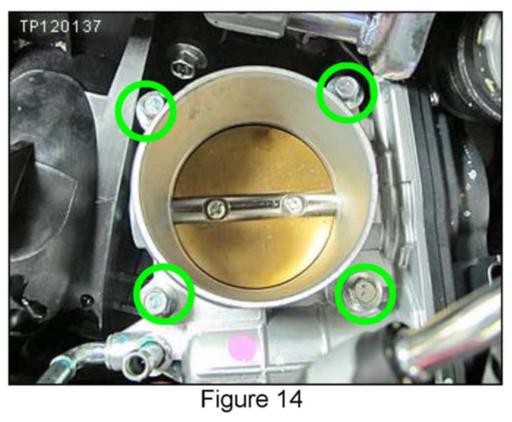 17. Using an 8 mm socket, remove 4 bolts (circled in green) securing the throttle body to the intake manifold.
