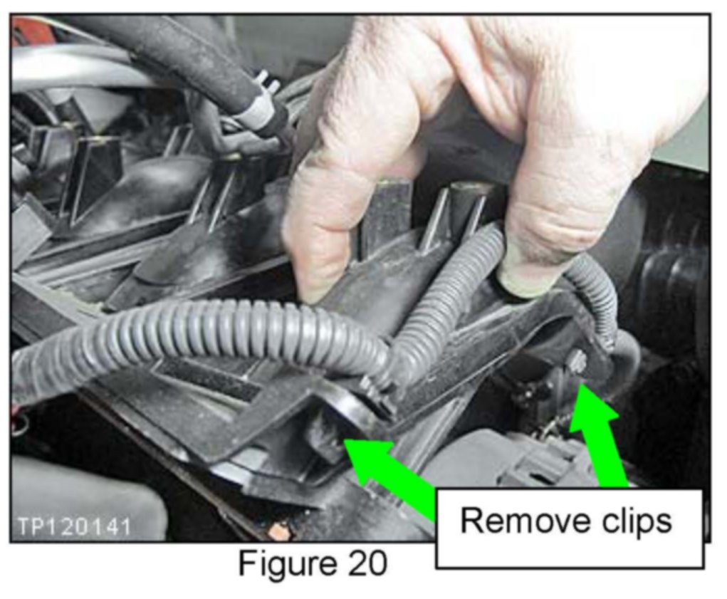 a. Lift up on left side of intake and remove alternator harness clips by pinching clip at bottom to remove from intake manifold.