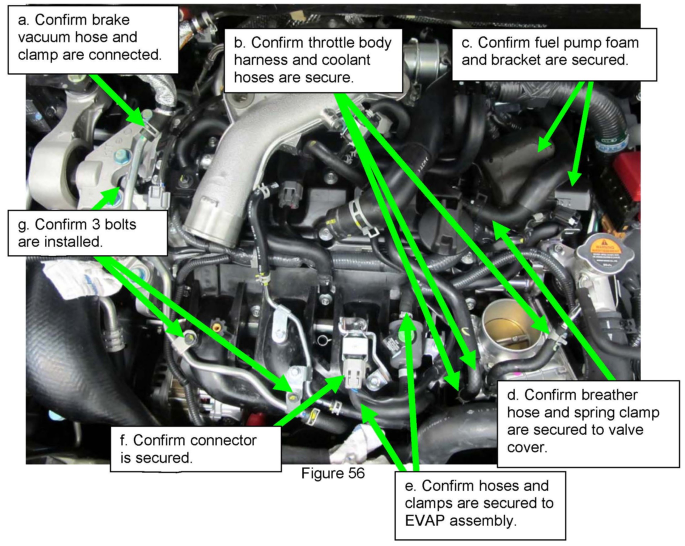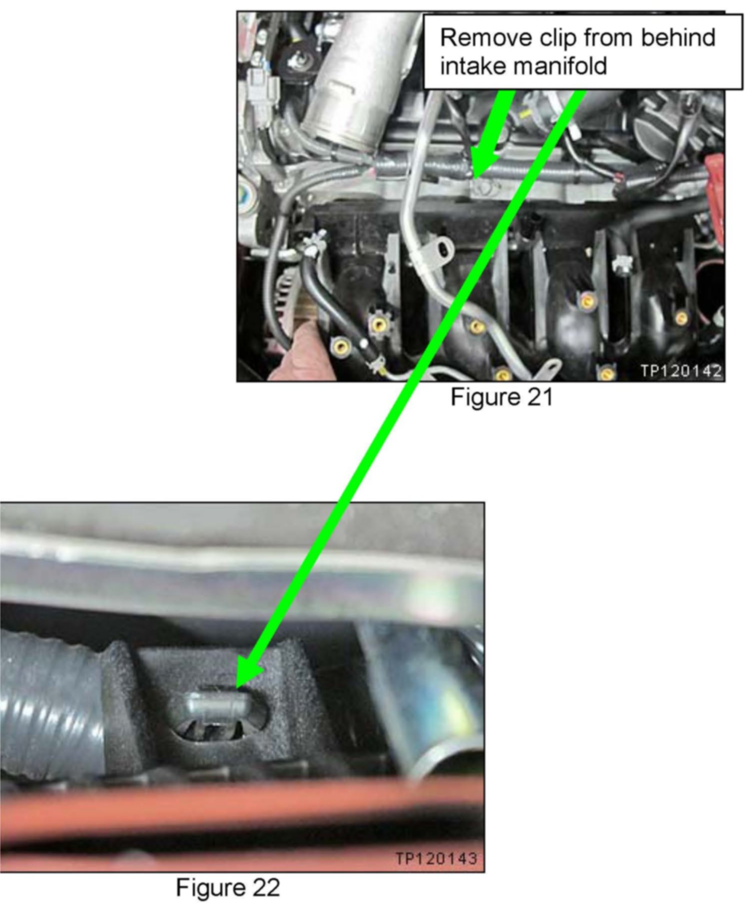 ^ Connect lower alternator harness clip (indicated by green arrows) to bottom of intake manifold.