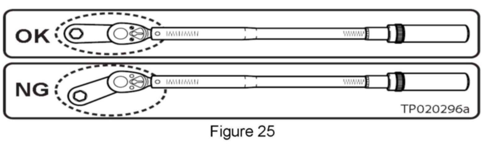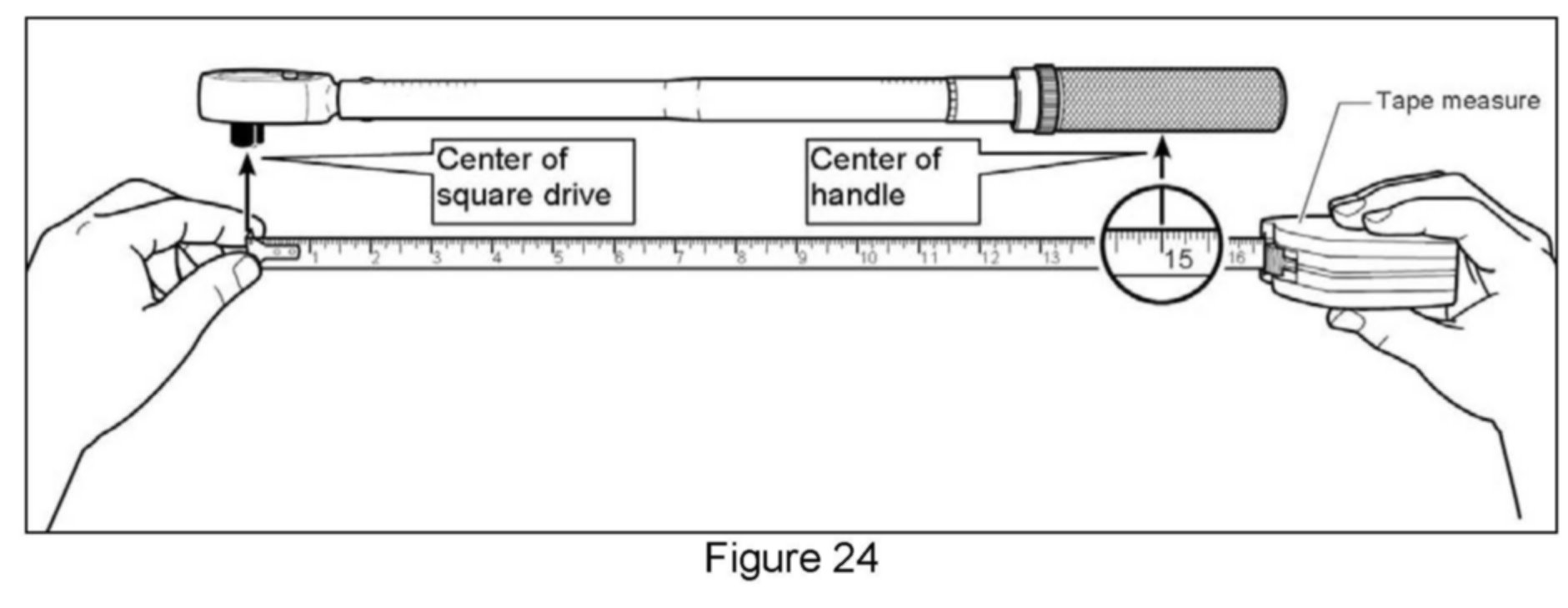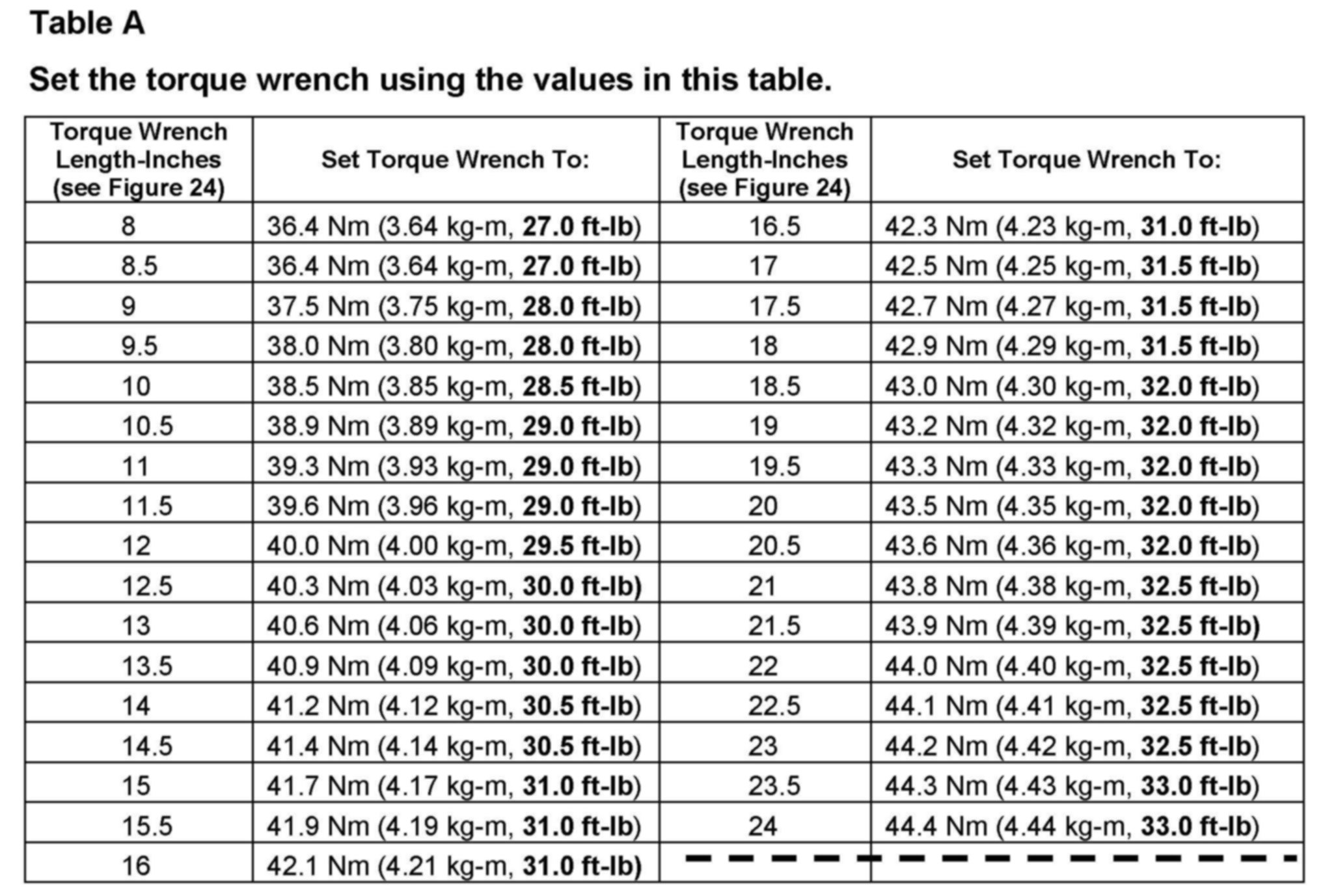 ^ Measure the length of your torque wrench between the center of the handle and the center of the square drive as shown in Figure 24, then go to Table A below to get the torque setting.
