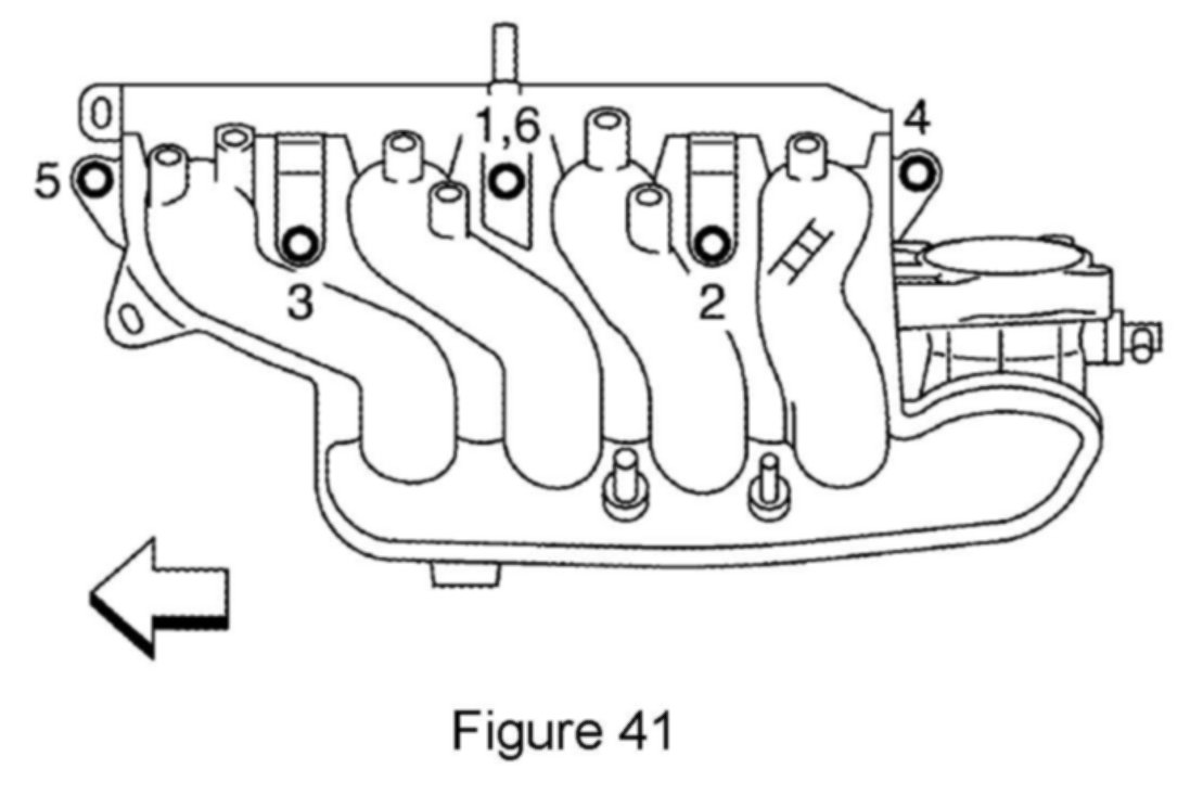 37. Hand start 6 intake manifold bolts (5 top bolts, 1 side bolt).