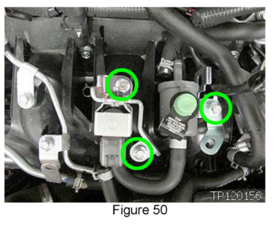 44. Secure EVAP valve and solenoid assembly using three 8 mm bolts (circled in green).