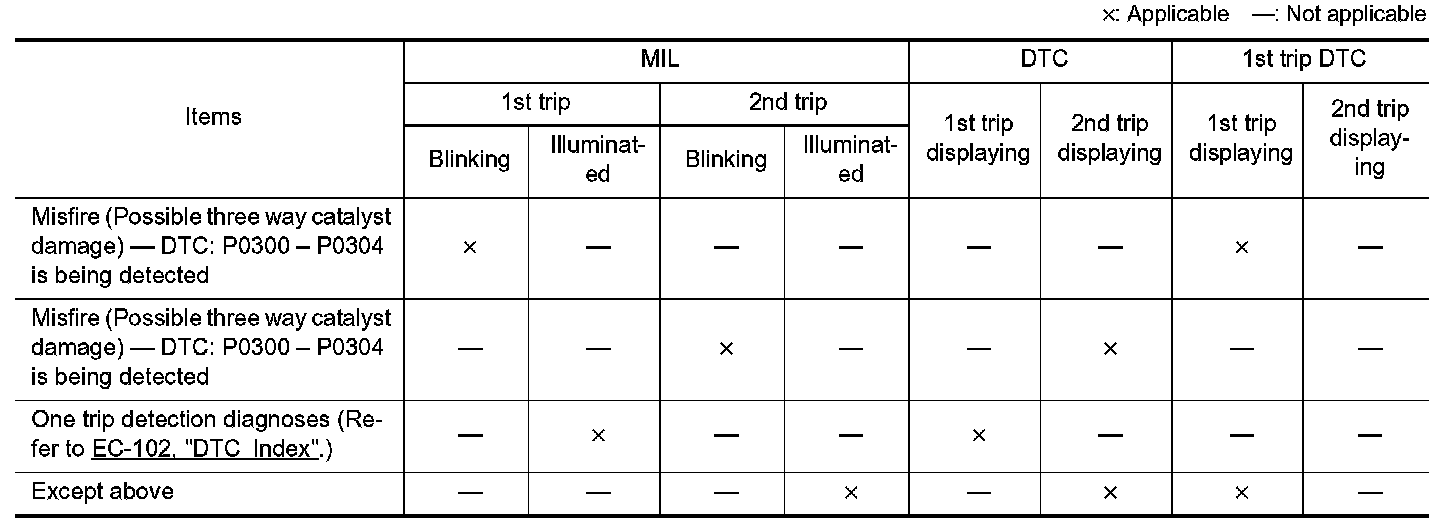 <2nd trip> The "trip" in the "Two Trip Detection Logic" means a driving mode in which self-diagnosis is performed during vehicle operation. Specific on board diagnostic items will cause the ECM to illuminate or blink the MIL, and store DTC and Freeze Frame data, even in the 1st trip, as shown below.