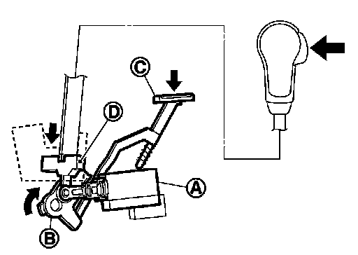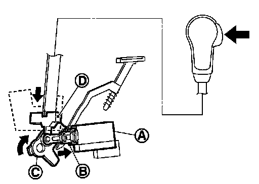 is compressed with the electromagnetic force. The connecting lock lever (C) rotates when the solenoid rod is compressed. Therefore, the detent rod (D) can be moved. The selector lever can be shifted to other positions for this reason.