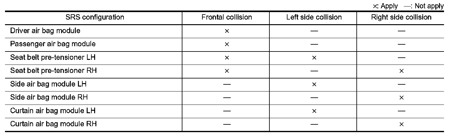 The operation of SRS is different depending on the collision modes applications. For example, the driver air bag module, passenger air bag module, and seat belt pre-tensioner are activated in a frontal collision or side collision.