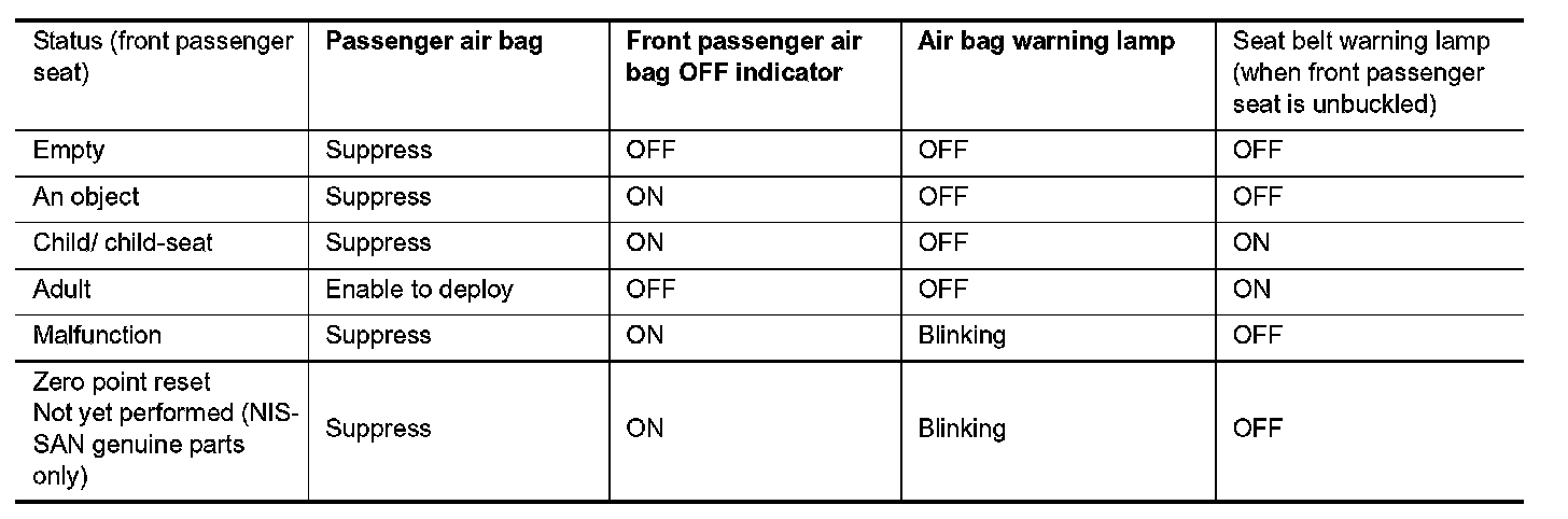 1.Suppress the deployment of front passenger air bag when front passenger seat is empty, or when occupied by child and child-seat. Turns ON front passenger air bag OFF indicator when front passenger seat is occupied by child-seat and child.