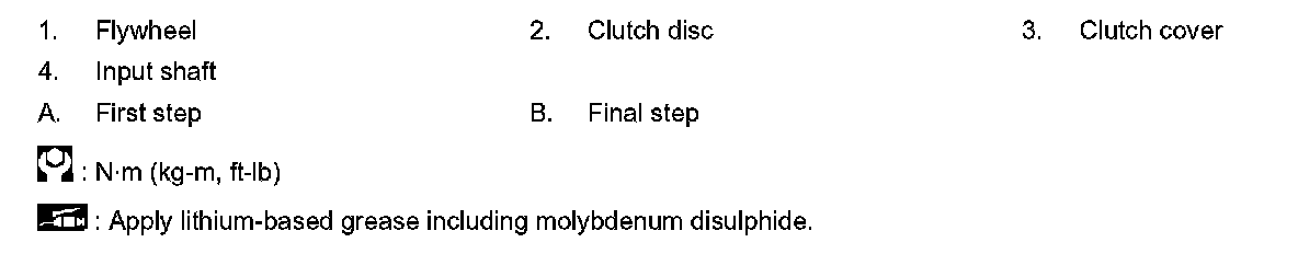 Tighten clutch cover mounting bolts to the specified torque evenly in two steps in the numerical order as shown in the figure.