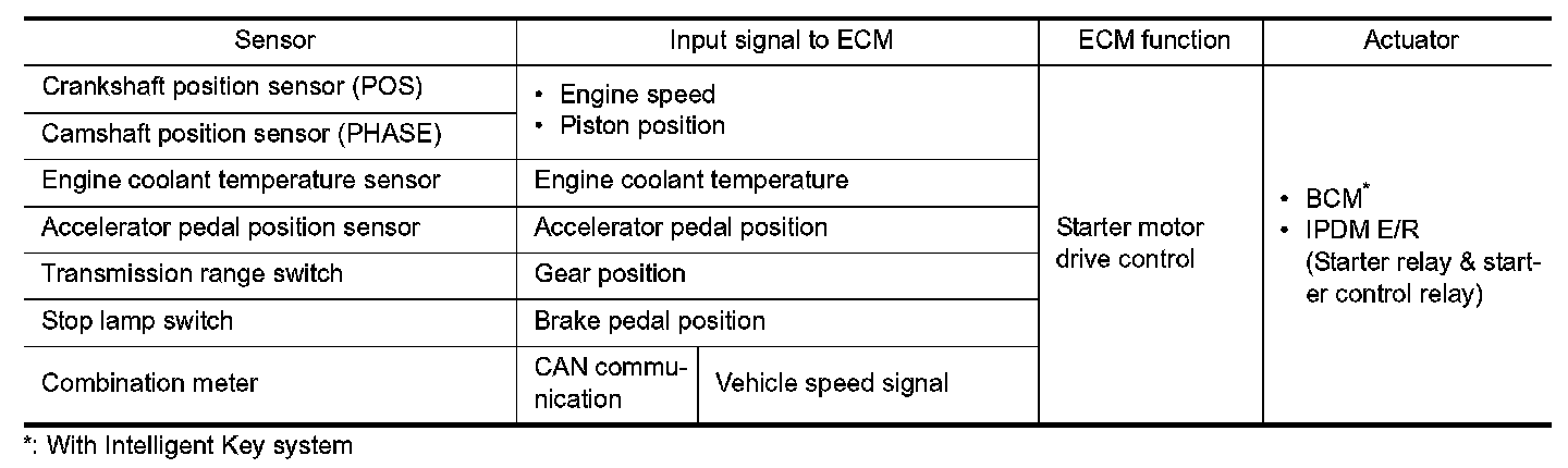 IPDM E/R detects an operating state of the starter motor relay and the starter motor control relay and transmits a feed back signal to ECM via CAN Communication.