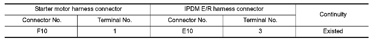 2.Check continuity between starter motor harness connector and IPDM E/R harness connector.