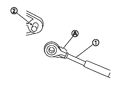 - When connecting the control cable (1) to the CVT shift selector assembly (2), face the grooved surface of the rib (A) up and insert the control cable until it stops.