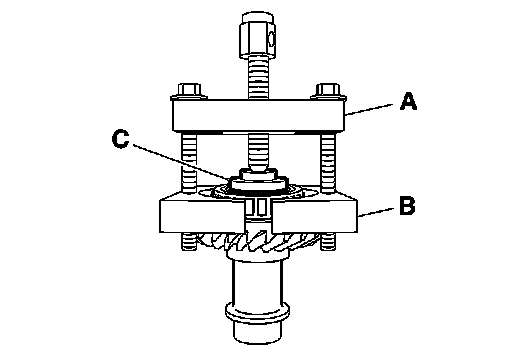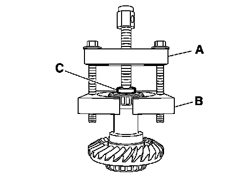 10.Remove inner race of side bearing (left), using the puller (A), the replacer (B) and the drift (C).