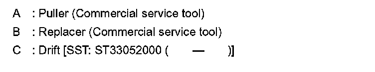 9.Remove inner race of side bearing (right), using the puller (A), the replacer (B) and the drift (C).