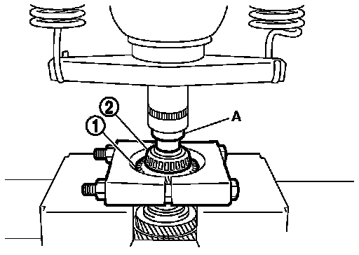 b.Remove mainshaft front bearing inner race, using the drift (A) [SST: ST-33052000 ( - )].