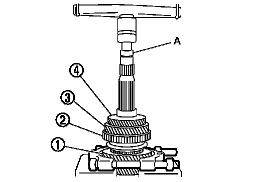 b.Remove 3rd main gear, busing, 2nd main gear, 2nd inner baulk ring, 2nd synchronizer cone, 2nd outer baulk ring, 1st-2nd synchronizer hub assembly, 1st outer baulk ring, 1st synchronizer cone, 1st inner baulk ring, and 1st main gear, using the drift (A) [SST: ST-33052000 ( - )].